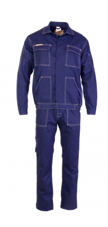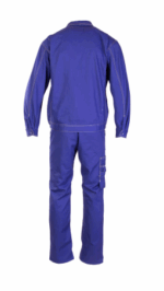 Costum salopeta de lucru format din pantalon cu pieptar si bluza salopeta, durabil, din colecția BRIXTON CLASSIC, confecționat din material rezistent poliester/bumbac (65%/35%), 290 g/m², cu cusături duble și întărituri în zonele expuse la uzură. Jacheta este prevăzută cu închidere cu nasturi acoperiți, buzunare funcționale, pense pentru libertate de mișcare și bandă elastică în talie. Salopeta are bretele late reglabile, buzunare multiple (telefon, ruletă, scule), buclă pentru ciocan și talie ajustabilă. Materialul își păstrează culoarea și forma după spălări repetate. Conform standardului EN 13688.